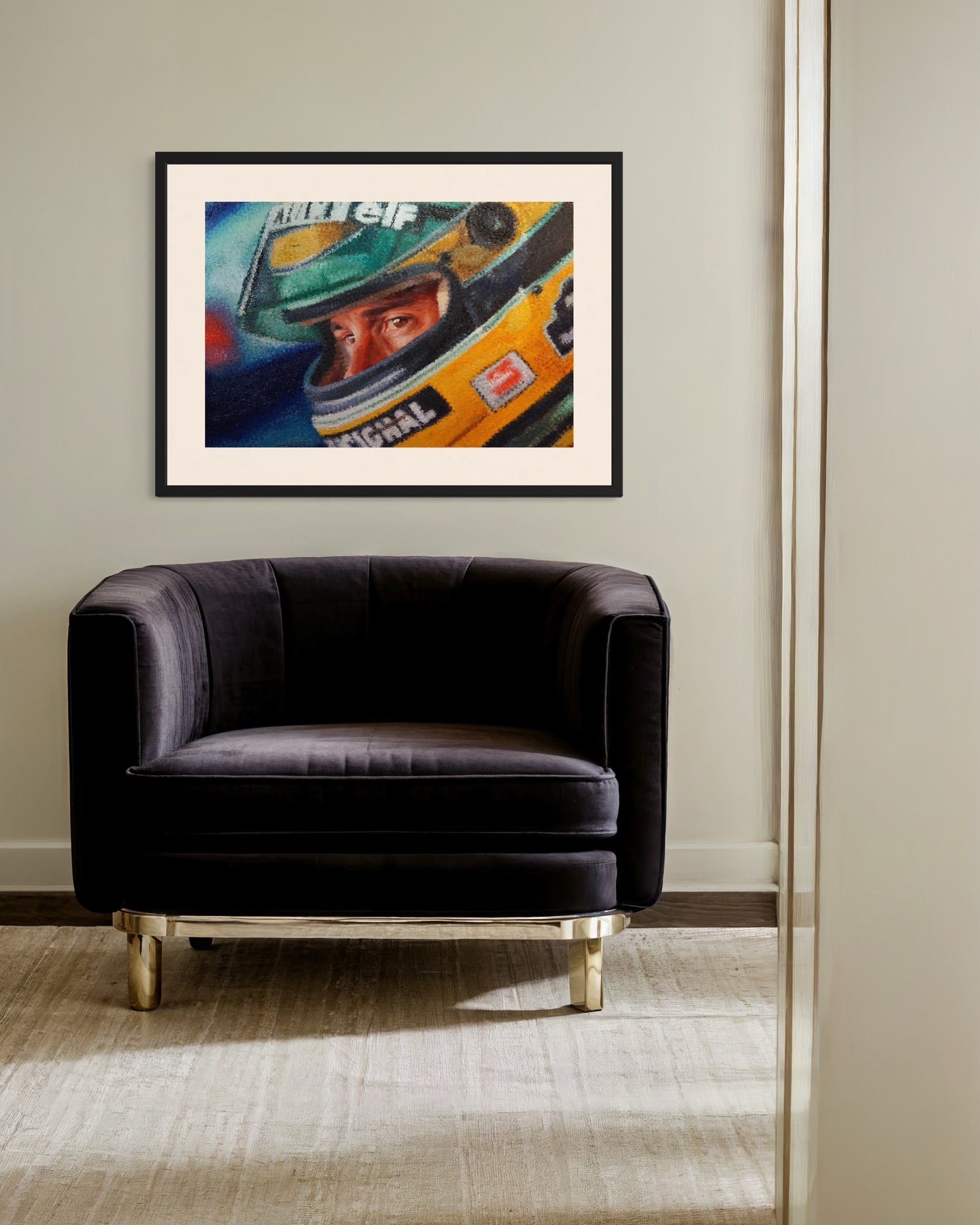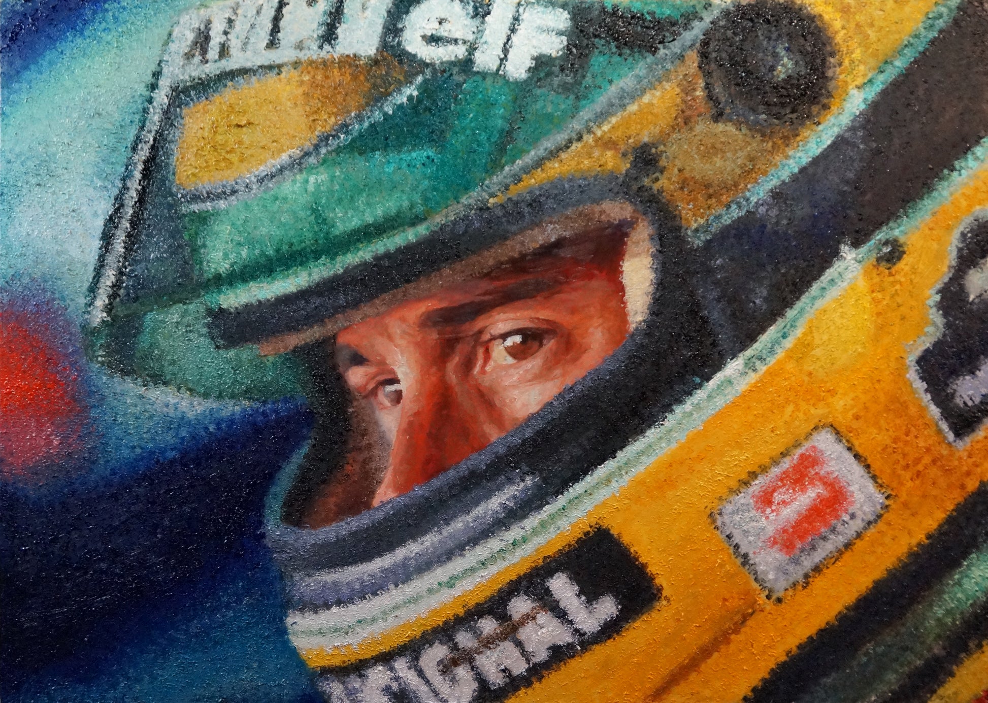 Esta obra es en honor a Ayrton Senna, mi intención fue capturar la esencia apasionada del legendario piloto de Fórmula 1. He tejido una narrativa visual que rinde homenaje a la mirada y la intensidad que Senna llevaba a cada carrera. En cada rincón de la obra, he procurado transmitir la grandeza y el legado perdurable de Ayrton Senna, un ícono eterno de la velocidad y la pasión por la competición automovilística.