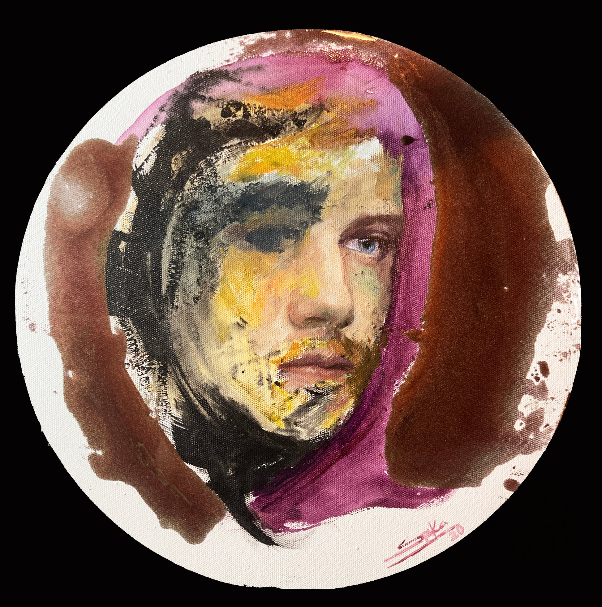 Este retrato al igual que la mujer fue un experimento de trabajar con distintas técnicas y superficies. Me gusta jugar con los sellos creando atmósferas simples pero con mucho lenguaje.