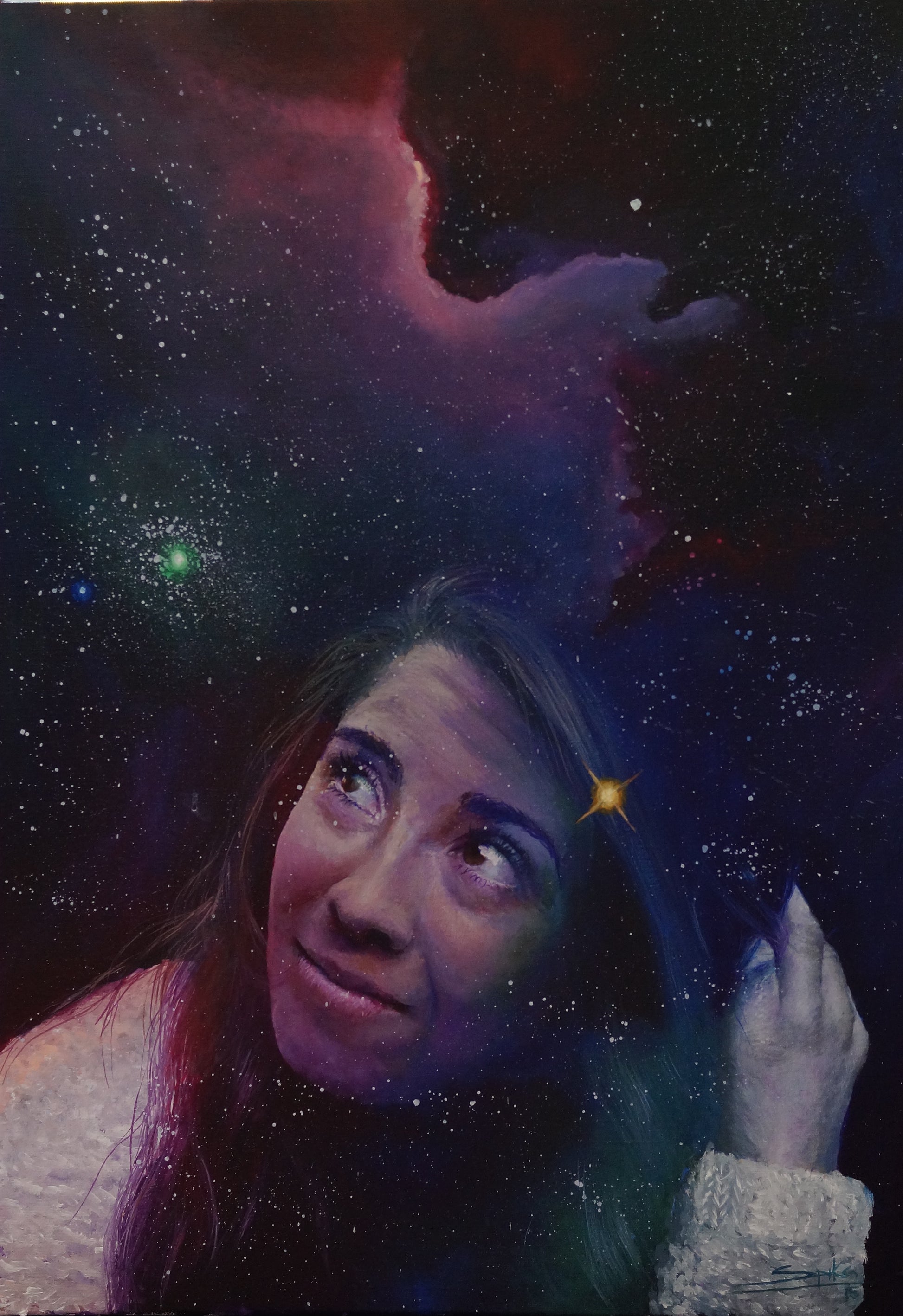Marianita es una amiga mia de toda la vida. Lo primero que hago es una sesión de fotos y ella eligió la nebulosa con la que se identificaba, eso lo hace personal y de esta manera se crea una obra más allá de solo ser el retrato, es representar su esencia.
