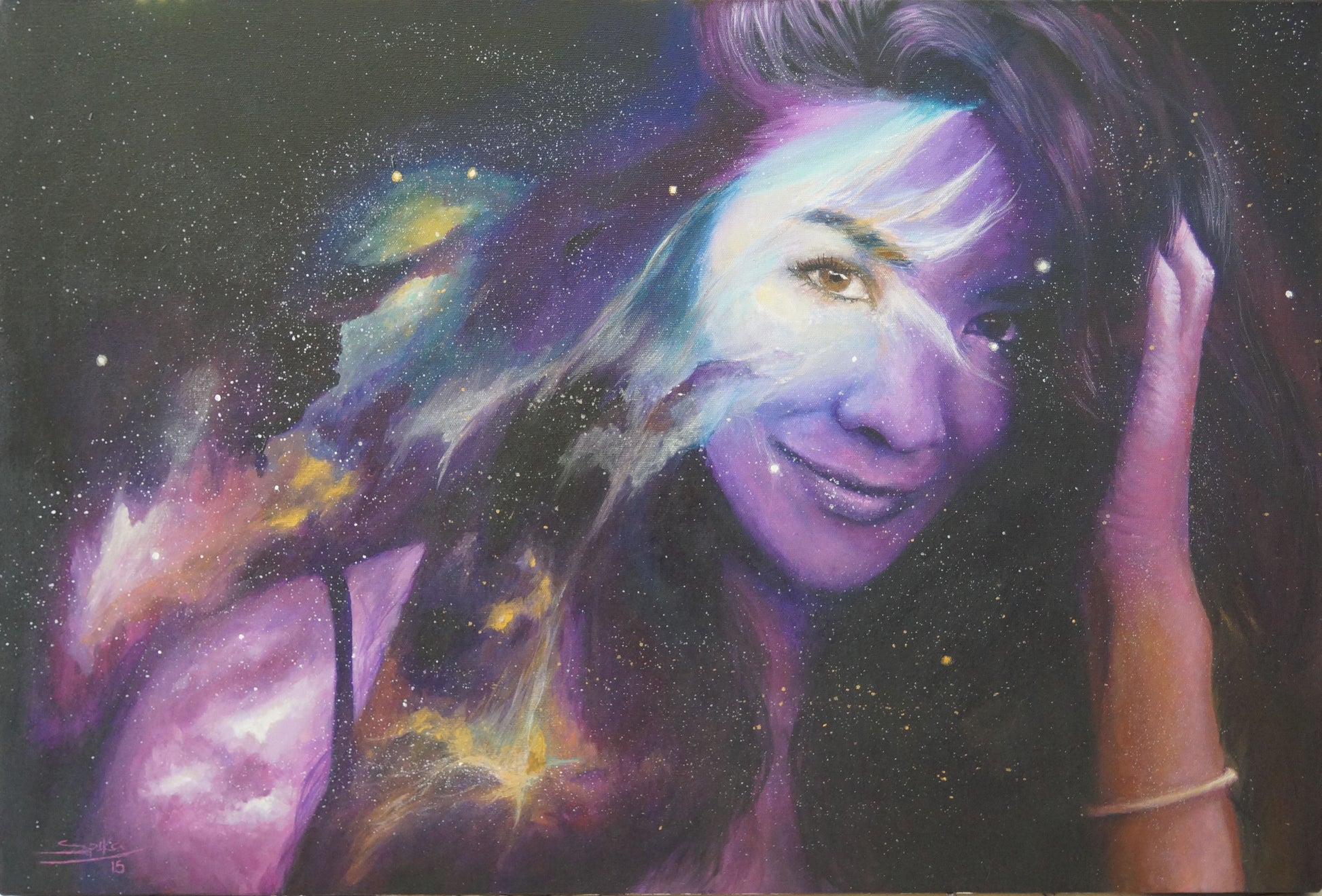 Este es un retrato de una gran amiga que también es artista. Forma parte de mi colección Cosmogonia, en el que todos somos polvo de estrellas. Me gusto capturar su esencia artistica.